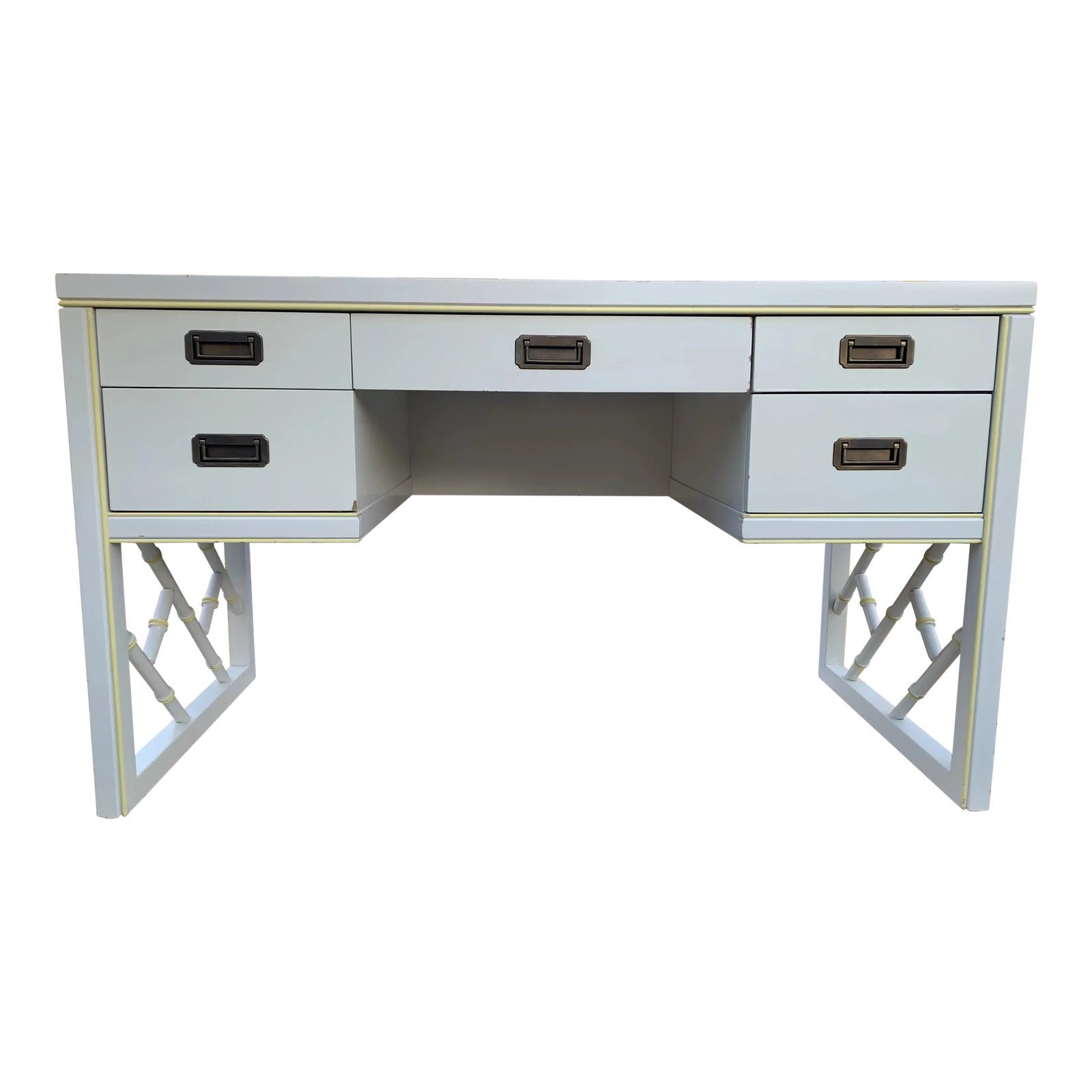 Here we have a charming Mid Century white lacquered faux bamboo campaign style desk. Made in America by Sligh. Many stylish details such as gilt tooled leather writing surface, faux bamboo fretwork, yellow pin striping and recessed campaign style hardware. Finished on all four sides and can be floated in the middle of the room.PLEASE NOTE: While this desk looks great from across the room, it is not perfect. There are many dings, scuffs, scrapes and chips. I’ve taken pics of the worst spots. Please enlarge and examine the photos carefully and feel free to ask questions.