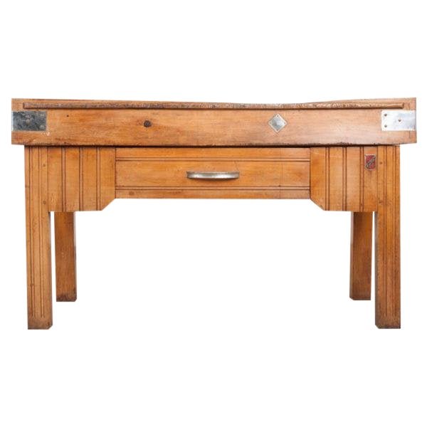 A fine butcher table, made in Nantes, France circa 1920. The table’s top boasts exceptional patination. A groove has been left from decades of knife work and butchery. The top is bound together with steel bindings that help to keep the top from splitting. The butcher block rests on a stylish pine base that has been influenced by the Art Deco movement that was occurring at the time of its construction. The base has a large drawer and the maker’s badge that has his name, R. Lerat, and even his shop’s address at 18 R’de Bouville in Nantes, France.less
